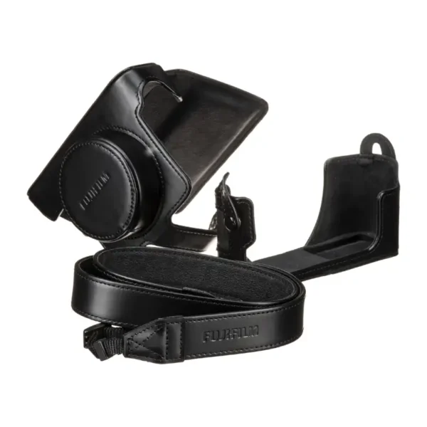 Αφιερωμένη στην ψηφιακή φωτογραφική μηχανή FUJIFILM X100V, η μαύρη δερμάτινη θήκη FUJIFILM LC-X100V έχει σχεδιασμό που ταιριάζει στη φόρμα και προστατεύει τη φωτογραφική μηχανή από ελαφρά χτυπήματα και γρατζουνιές και βελτιώνει το κράτημα κατά το χειρισμό και τη λήψη. Είναι κατασκευασμένη από δέρμα για πολυτελή αίσθηση και διατηρεί την πρόσβαση στην μπαταρία και σε μια θήκη για κάρτες μνήμης ενώ είναι προσαρτημένη.
